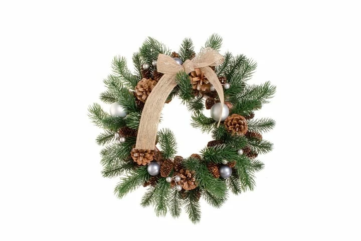 Kaunis ja kestävä joulukranssi, jossa koristeena juuttinaru, käpyjä ja hopeisia palloja. Koko 36cm.