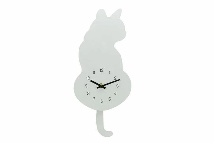 Valkoinen kissakello jossa heiluva häntä. Koko 17,2 x 4,5 x 40cm, materiaali MDF, musta, toimii 2xAA paristolla.